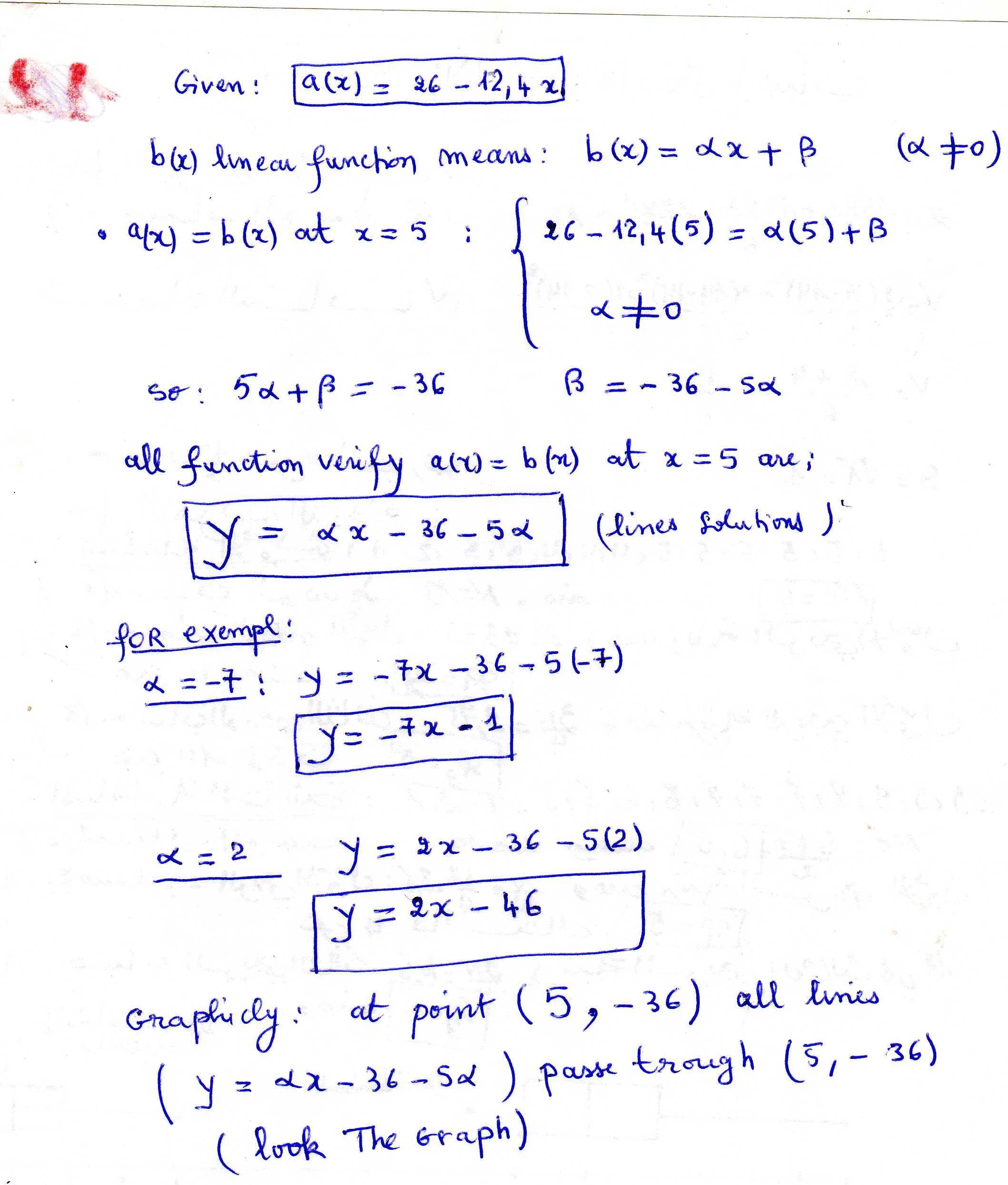a linear function is given a(x)=26-12.4x. the function b is also linear. the equation a(x)=b(x) has exactly one solution at x=5