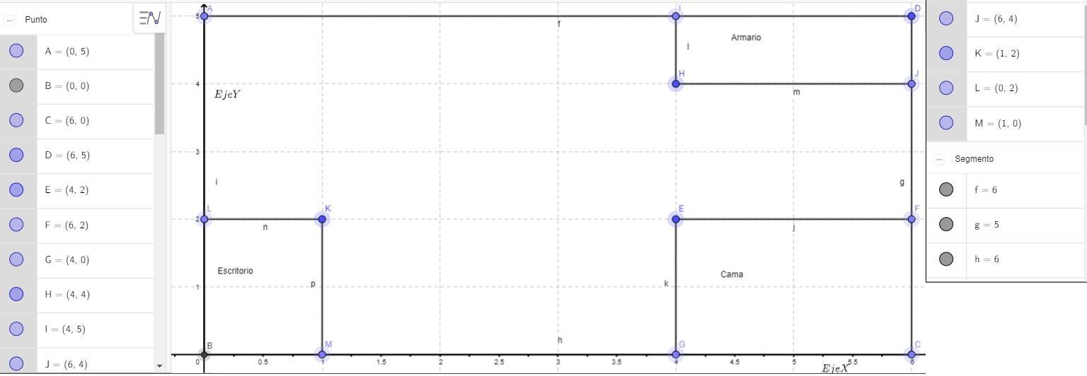 On the sides you can find the coordinates of the ends of the bed room, the closet and the study table.