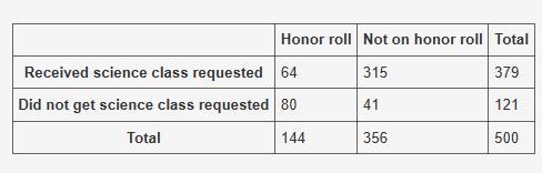 . He asked 500 students at his school the following questions: "Are you on the honor roll?" and "Did you get the science class you requested?" The results are shown in the table below: