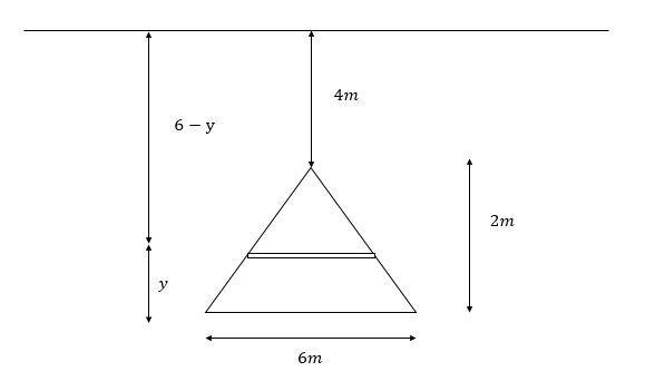 A triangular plate with base 6 m and height 2 m is submerged vertically in water such that the highest vertex of the plate is 4