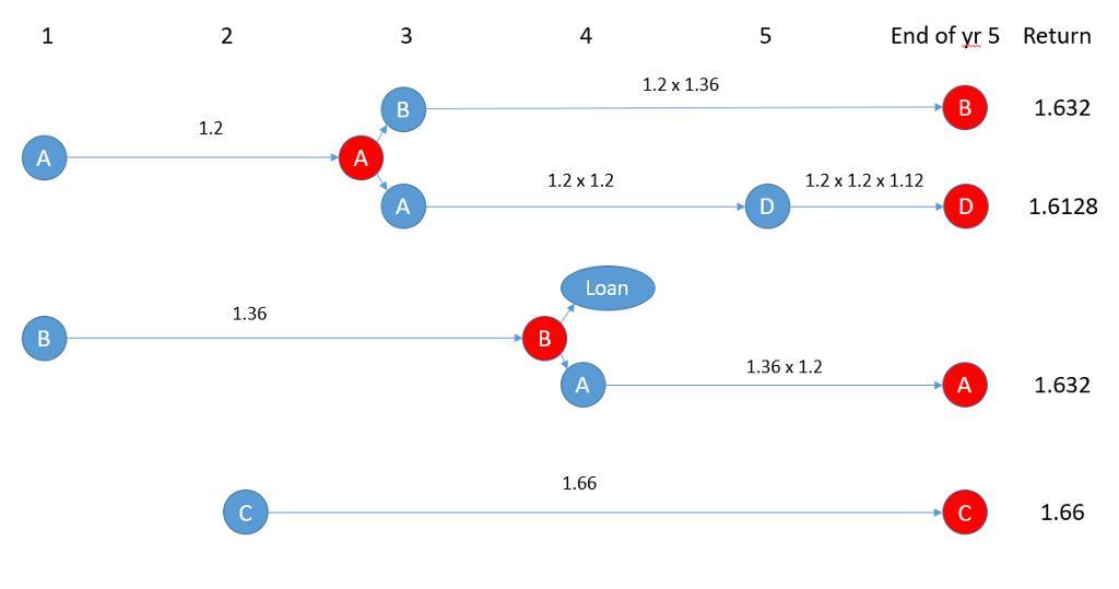 According to this chart, Uncle can get maximum return only from option C. So he should invest everything there, however he needs to pay off 24,000 loan at the end of Year 3. Therefore, he needs to invest an amount that will yield him 24000 at then end of year 3, in Plan B.
