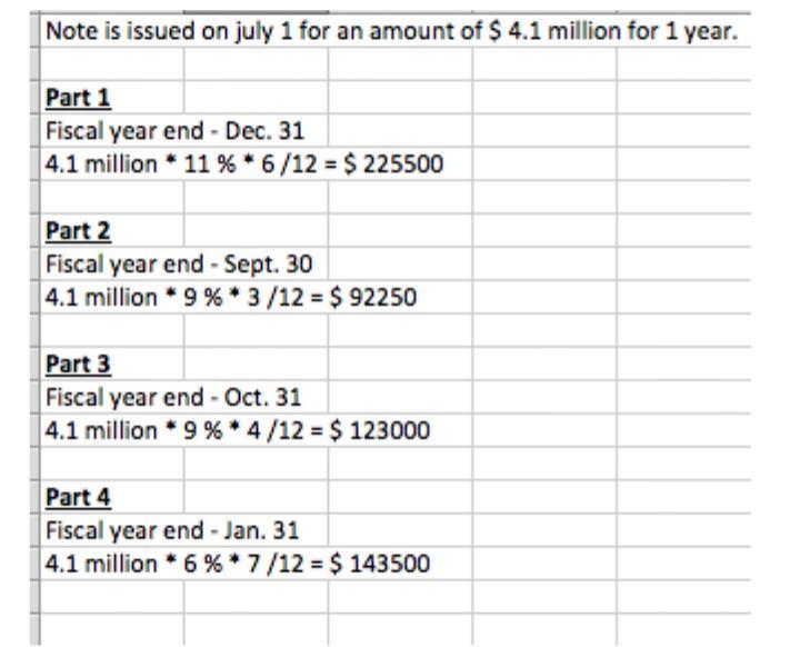 airline industry. Assume that on July 1 the company issues a one-year note for the amount of $4.1 million. Interest is payable at maturity. Required: Determine the amount of interest expense that should be recorded in a year-end adjusting entry under each of the following independent assumptions: (Enter your answers in dollars, not in millions (i.e. 5 should be entered as 5,000,000).)