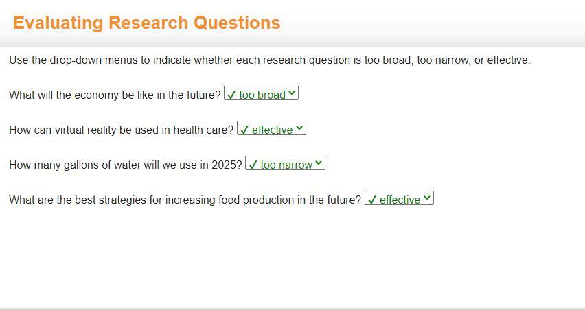 For the first question, the reason why it is too broad is because the economy in the future is a huge topic. It will not be able to be covered in one topic. In questions two, the reason why the answer is effective is because this is a specified research question in a wide category. For the third question, the answer is too narrow because there is really no use of knowing how much gallons of water we will use in 2025. Finally, in the fourth question the answer is effective because it is a specified research question in a specific topic/category.