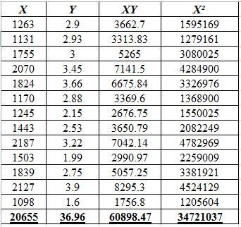 \alpha = \frac{\sum{Y} \cdot \sum{X^2} - \sum{X} \cdot \sum{XY} }{n \cdot \sum{X^2} - \left(\sum{X}\right)^2} =             \frac{ 36.96 \cdot 34721037 - 20655 \cdot 60898.47}{ 13 \cdot 34721037 - 20655^2} \approx 1.028 \\ \\\beta = \frac{ n \cdot \sum{XY} - \sum{X} \cdot \sum{Y}}{n \cdot \sum{X^2} - \left(\sum{X}\right)^2}        = \frac{ 13 \cdot 60898.47 - 20655 \cdot 36.96 }{ 13 \cdot 34721037 - \left( 20655 \right)^2} \approx 0.001\end{aligned}