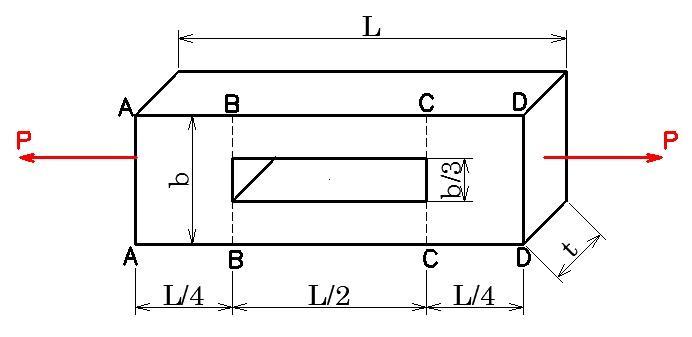 A rectangular bar of length L has a slot in the central half of its length. The bar has width b, thickness t, and elastic modulu