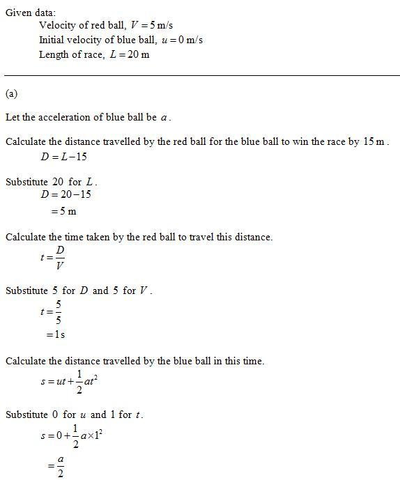(a) What would the blue ball's acceleration have to be for the blue ball to win the race by a distance of 15.0 meters?