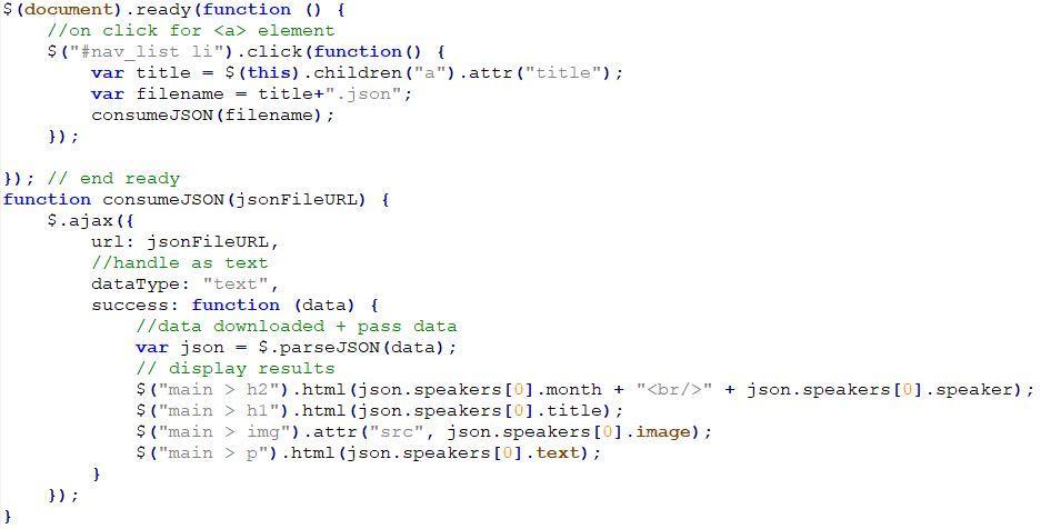 lements in the sidebar, use the title attribute for each link to build the name of the JSON file that needs to be retrieved. Then, use that name to get the data for the speaker, enclose that data in HTML elements that are just like the ones that are used in the starting HTML for the first speaker, and put those elements in the main element in the HTML. That way, the CSS will work the same for the Ajax data as it did for the starting HTML. 2. Don’t forget to clear the elements from the main element before you put the new Ajax data in that element. 3. Verify there are no errors.