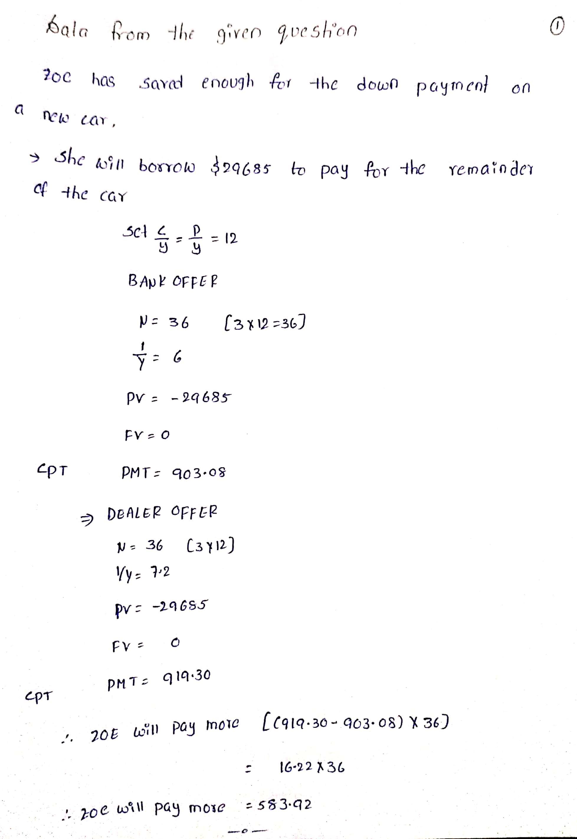 a new car. She will borrow $29,685 to pay for the remainder of the car. She plans to make monthly payments for the next 3 years to pay off the loan. Her bank offers her a loan at 6% annual interest. The car dealer offers her a slightly higher rate of 7.2%. Zoe is not sure it is worth the hassle of going to the bank when she could simply complete the transaction at the dealer. How much more will Zoe pay over the life of the loan if she takes the 7.2% loan?