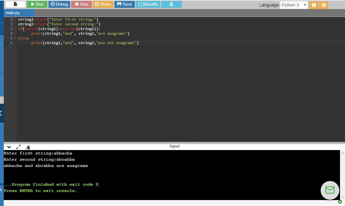 • aaabbbc=aaabbbc so these are equal which means string1 and string2 are anagrams.