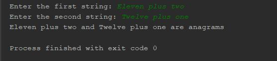 rams or not. You have to ignore the case and space characters. Write a test program for that prompts the user to input two strings and invokes this method. Some example runs are: Enter the first string: abbacba Enter the second string: abcabba abbacba and abcabba are anagrams Enter the first string: banana Enter the second string: cabana banana and cabana are NOT anagrams Enter the first string: Eleven plus two Enter the second string: Twelve plus one Eleven plus two and Twelve plus one are anagrams