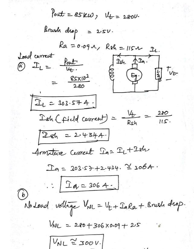 A dc shunt generator rated at 85 kW produces a voltage of 280 V. The brush voltage drop is 2.5 V, and the armature and field res