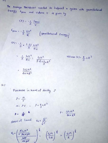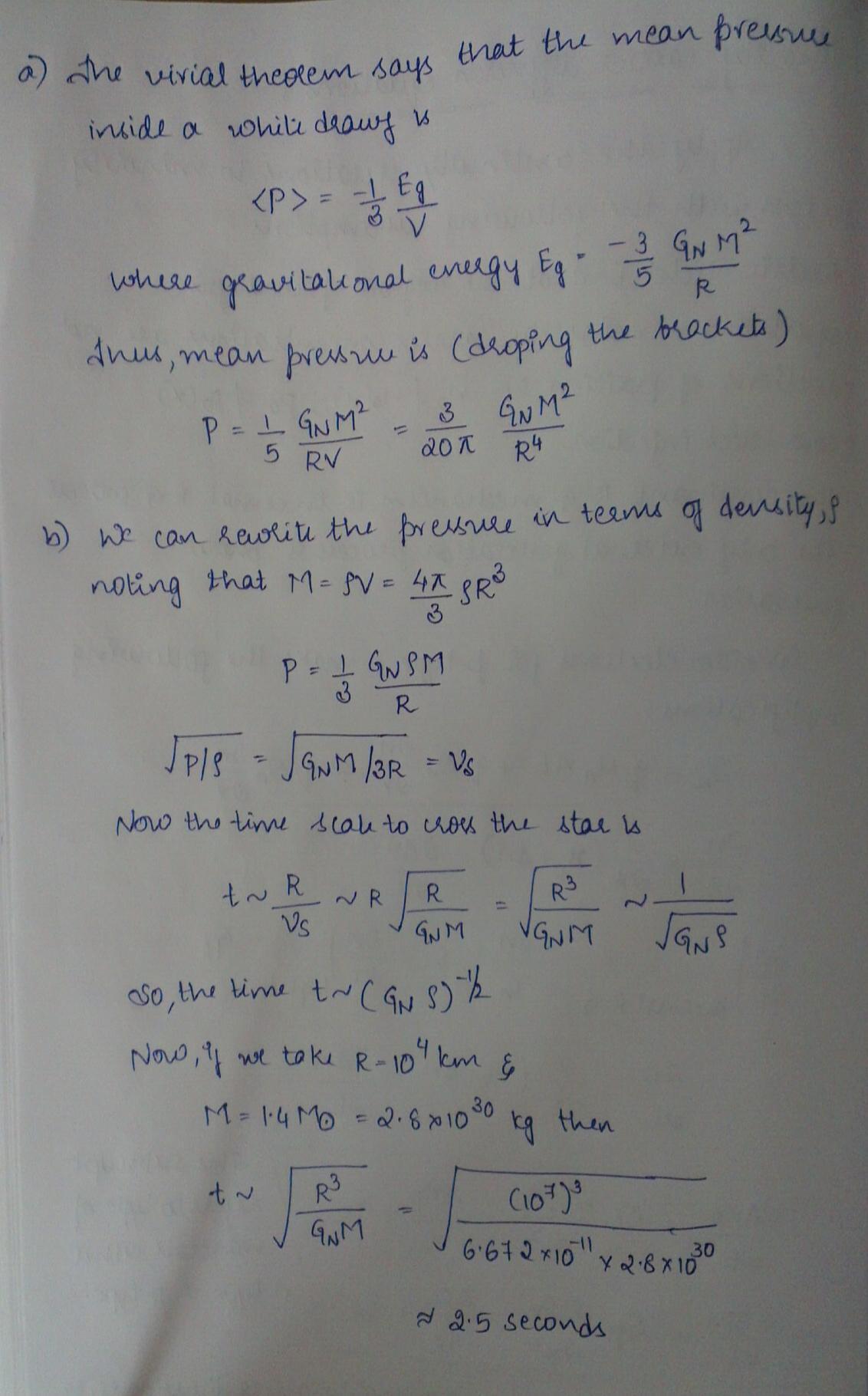 khar limit. a. Use the virial theorem to obtain an expression for the mean pressure inside a white dwarf of mass M and radius R. b. Use the result of (a) to estimate, to an order of magnitude, the speed of sound, vs = p dP/drho ∼ p P/rho, inside a white dwarf. In an accreting white dwarf with a carbon core that has reached nuclear ignition temperature, a nuclear burning "flame" encompasses the star at the sound velocity or faster. Within how much time, in seconds, does the flame traverse the radius of the white dwarf, assuming R = 104 km, M = 1.4M¯? Note that this soundcrossing timescale is ∼ (Grho) −1/2 , which is also the free-fall timescale (Eq. 3.15.)