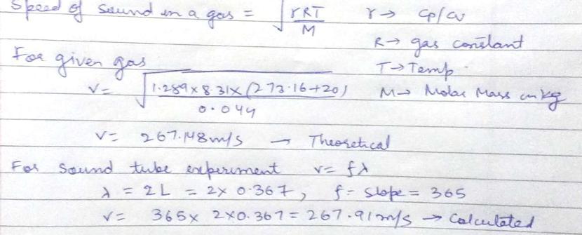 ained for the slope of the straight line fitting of the experimental points the value 365.0. Compare the speed of sound following from that slope to the calculated speed of sound from the gas properties? For CO2, Cp/Cv = 1.289, and the mass of one mol CO2 is 0.044 kg. The sound tube length is 0.367 m. The additional necessary datum is given in the text.