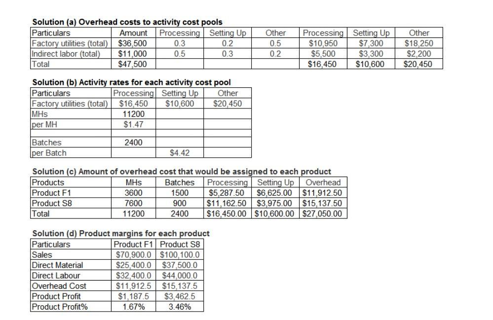 company's overhead costs, which consist of factory utilities and indirect labor, are allocated to the cost pools in proportion to the activity cost pools' consumption of resources. Costs in the Processing cost pool are assigned to products based on machine-hours (MHs) and costs in the Setting Up cost pool are assigned to products based on the number of batches. Costs in the Other cost pool are not assigned to products. Data concerning the two products and the company's costs and activity-based costing system appear below: