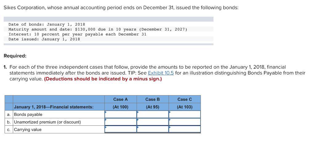 8 Maturity amount and date: $300,000 due in 10 years (December 31, 2027) Interest: 10 percent per year payable each December 31 Date issued: January 1, 2018 Required: For each of the three independent cases that follow, provide the amounts to be reported on the January 1, 2018, financial statements immediately after the bonds are issued. TIP: See Exhibit 10.5 for an illustration distinguishing Bonds Payable from their carrying value. (Deductions should be indicated by a minus sign.)