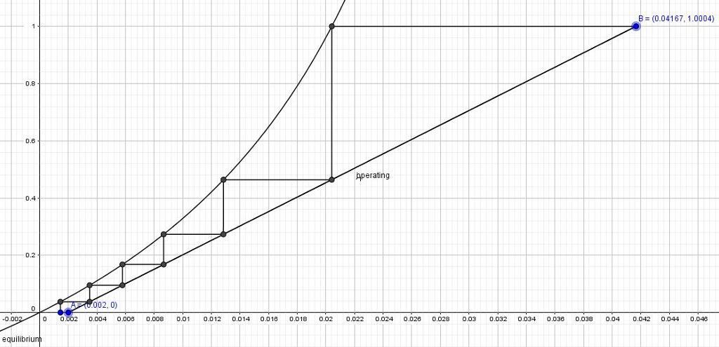Starting from point B, stretch horizontal line up to equilibrium curve and from there again go down to operating line as shown in the picture attached. This procedure give one count of tray and continue the same procedure up to end of operating.
