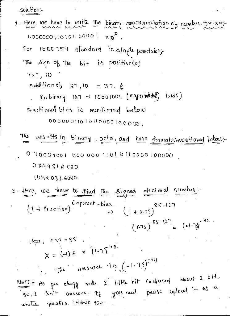 2. Write the binary representation of number 1037.379 in IEEE 754 standard in single precision. Express the result in binary, oc