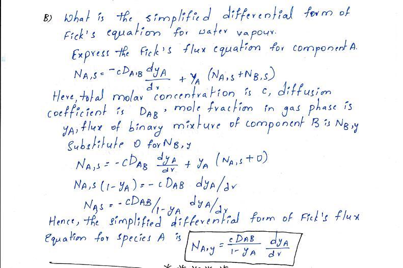 g the droplet. The droplet initially has a radius R. As the liquid water slowly evaporates, the droplet shrinks slowly with time, but the flux of the water vapor is at a nominal steady state. The temperature of the droplet and the surrounding still air are kept constant. The air contains water vapor of fixed concentration at an infinitely long distance from the droplet’s surface. After drawing a picture of the physical process, select a coordinate system that will best describe this diffusion process, list at least five reasonable assumptions for the mass-transfer aspects of the water-evaporation process, and simplify the general differential equation for mass transfer in terms of the flux NA. Finally, specify the simplified differential form of Fick’s flux equation for water vapor (species A), and propose reasonable boundary conditions.