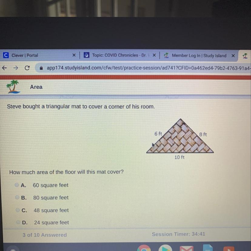 Steve bought a triangular mat to cover a corner of his room. How much area of the floor will this mat cover?