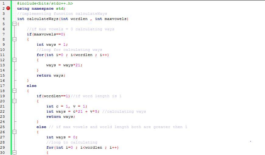 int ways = calculateWays(wordlen , maxvowels); //passing values to function calculateWays