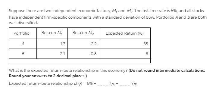 ecific components with a standard deviation of 47%. portfolios a and b are both well diversified. portfolio beta on m1 beta on m2 expected return (%) a 1.6 2.2 37 b 2.1 -0.6 15