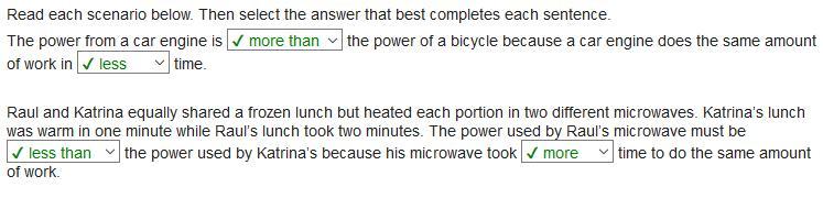The power from a car engine is the power of a bicycle because a car engine does the same amount of work in time. raul and katrina equally shared a frozen lunch but heated each portion in two different microwaves. katrina's lunch was warm in one minute while raul's lunch took two minutes. the power used by raul's microwave must be the power used by katrina's because his microwave took time to do the same amount of work.