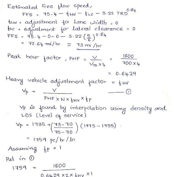 within 6 ft of the pavement edges, and there are two ramps within three miles upstream of the segment midpoint and three ramps within three miles downstream of the segment midpoint. A weekday directional peak-hour volume of 1800 vehicles (familiar users) is observed, with 700 arriving in the most congested 15-min period. If a LOS no worse than C is desired, determine the maximum number of heavy vehicles that can be present in the peak-hour traffic stream.