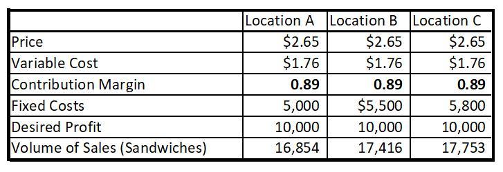 ee locations. Each would have the same labor and materials costs (food, serving containers, napkins, etc.) of $1.76 per sandwich. Sandwiches sell for $2.65 each in all locations. Rent and equipment costs would be $5,000 per month for location A, $5,500 per month for location B, and $5,800 per month for location C. a. Determine the volume necessary at each location to realize a monthly profit of $10,000.