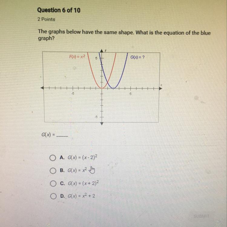 Step-by-step explanation: It is 2 on the X-Axis so it would be G(x) = X^2 + 2