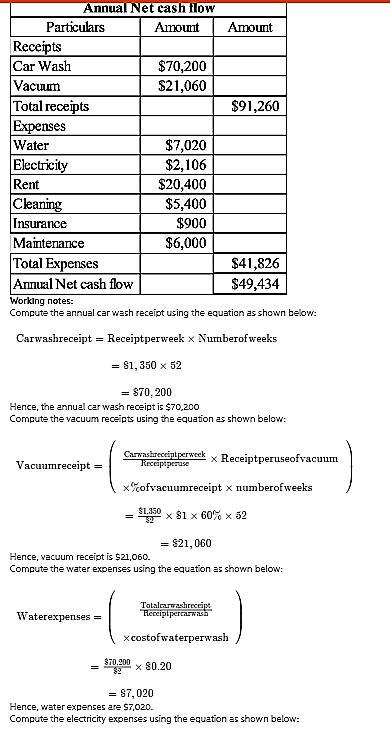 Required:1. Assuming that the car wash will be open 52 weeks a year, compute the expected annual net cash receipts from its operation.Auto wash cash receipts.................Vacuum cash receipts.............................TOTAL cash receipts.....................Less cash disbursements:Water............Electricity.......................Rent......................Cleaning.....................Insurance...........................Maintenance....................TOTAL cash disbursements..........Annual net cash flow from operations..............................................