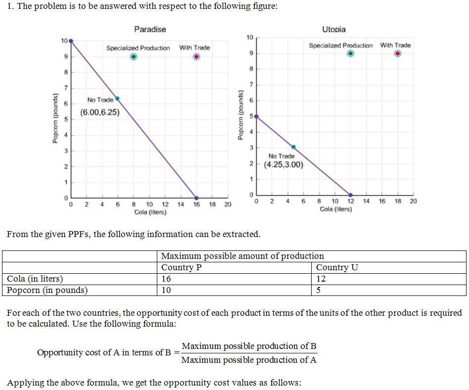 ities Frontiers for both countries, with current production levels marked by the blue point labeled \"No Trade.\" Note that the no trade point for Paradise is (6.00 cola, 6.25 popcorn) and the no trade point for Utopia is (4.25 cola, 3.00 popcorn). Use this information to answer the three questions below. Paradise UtopiaThe nations of Utopia and Paradise both produce popcorn and cola. They currently do not trade. Below are the Production Possibilities Frontiers for both countries, with current production levels marked by the blue point labeled \"No Trade.\" Note that the no trade point for Paradise is (6.00 cola, 6.25 popcorn) and the no trade point for Utopia is (4.25 cola, 3.00 popcorn). Use this information to answer the three questions below. Paradise Utopia1. Utopia and Paradise both decide to specialize in one product and trade for the other. Move the green \"Specialized Production\" points to reflect their new output levels. 2. Which of these prices, or terms of trade, will allow both countries to gain from trade?3. Utopia decides to sell half of its production to Paradise at this trading price. Move the \"With Trade\" points to the combination of popcorn and cola each country will be able to consume after trade.