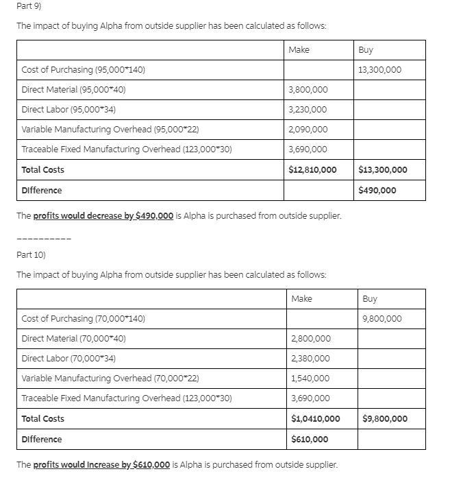 c. Assume that Cane expects to produce and sell 70,000 Alphas during the current year. A supplier has offered to manufacture and deliver 70,000 Alphas to Cane for a price of $140 per unit. If Cane buys 70,000 units from the supplier instead of making those units, how much will profits increase or decrease?