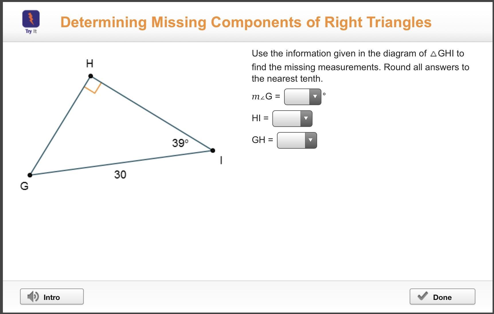 Use the information given in the diagram of TriangleGHI to find the missing measurements. Round all answers to the nearest tenth