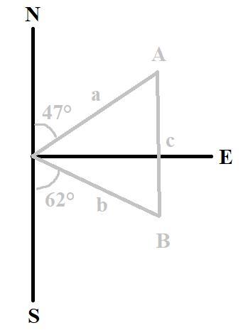 The angle that they make, as rider A was in the direction N 47 E and the rider B was in the direction S 62 E, is equal to 180 - 47 - 62 = 71°