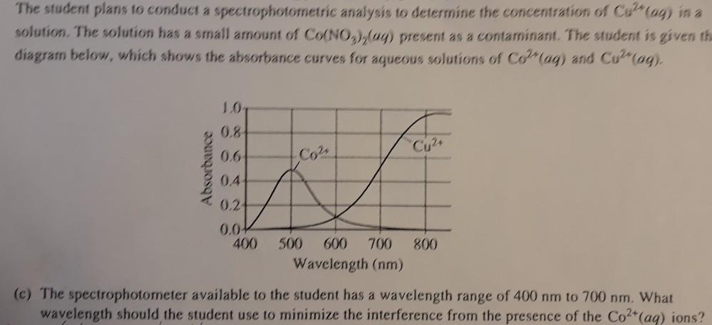 c. The spectrophotometer available to the student has a wavelength range of 400 nm to 700 nm. What wavelength should the student use to minimize the interference from the presence of the Co2+ (aq)?