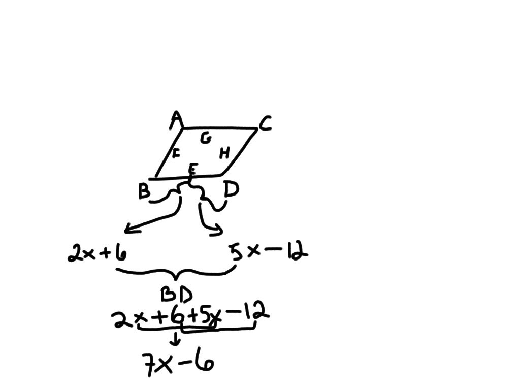 Given BE=2x+6 and ED=5x-12 in parallelogram ABCD find BD