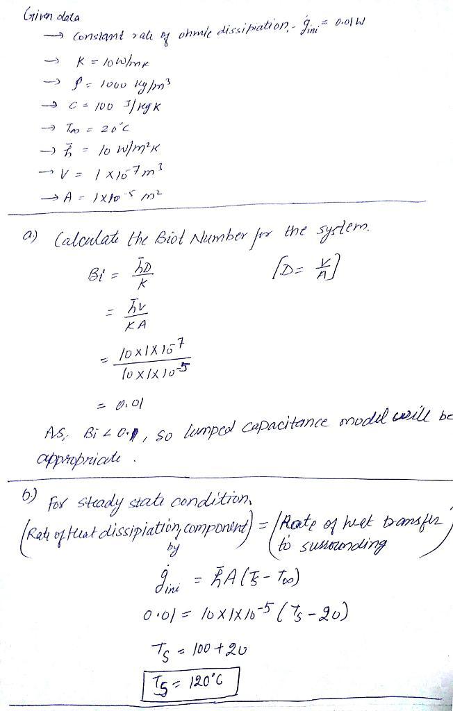 conversion of electrical to thermal energy. The component has conductivity k = 10 W/m-K, density r = 1000 kg/m3 , and specific heat capacity c = 100 J/kg-K. The surface of the component is cooled by convection with air at T[infinity] = 20ºC and heat transfer coefficient h = 10 W/m2 -K. The volume of the component is V = 1x10-7 m3 and its surface area is As = 1x10-5 m2.