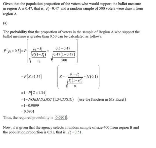 random sample of 500 voters from one region, Region A, of the city. Assume that the population proportion of voters who would support the ballot measure in Region A is 0.47.