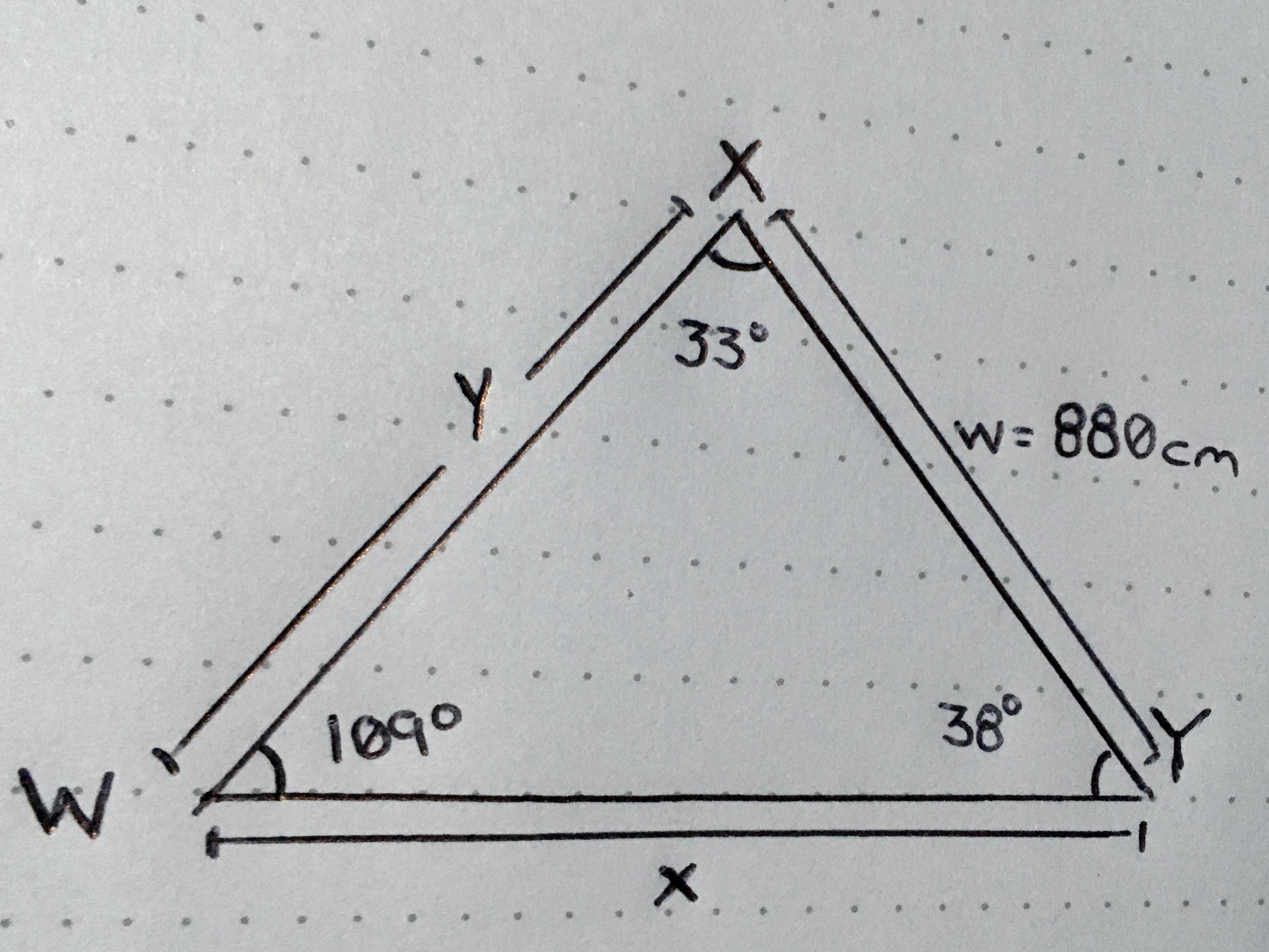 \frac{w}{sin(W)} =\frac{y}{sin(Y)}\\\\\frac{880}{sin(109)} =\frac{y}{sin(38)}\\\\Solving\hspace{3}for\hspace{3}y\\\\y=\frac{880*sin(38)}{sin(109)} \\\\y=572.9999518\approx 573 cm