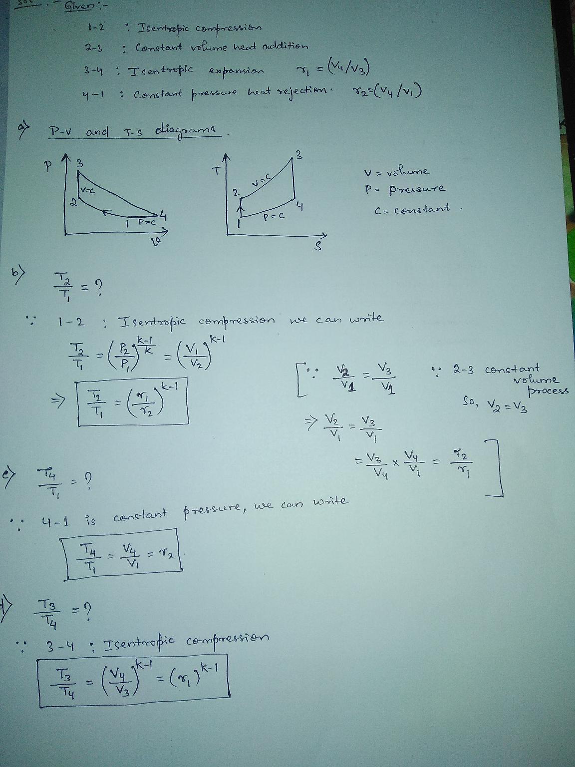 g four processes: 1-2 Isentropic compression 2-3 Constant volume heat addition 3-4 Isentropic expansion with a volume ratio, r1=V4/V3 4-1 Constant pressure heat rejection with a volume ratio, r2=V4/V1 (a) Sketch the P-v and T-s diagrams for this cycle. (b)Find out T2/T1 as a function of k, r1, r2 only. (c) Find out T4/T1 as a function of k, r1, r2 only. (d)Find out T3/T4 as a function of k, r1, r2 only. (e) Find out T3/T2 as a function of k, r1, r2 only. (f) Obtain an expression for the back work ratio for a fixed minimum-tomaximum temperature ratio T1/T3. The expression should be of a function of T1/T3, k, r1, r2 only. (g)Obtain an expression for the cycle thermal efficiency as a function of k, r1, r2 only.