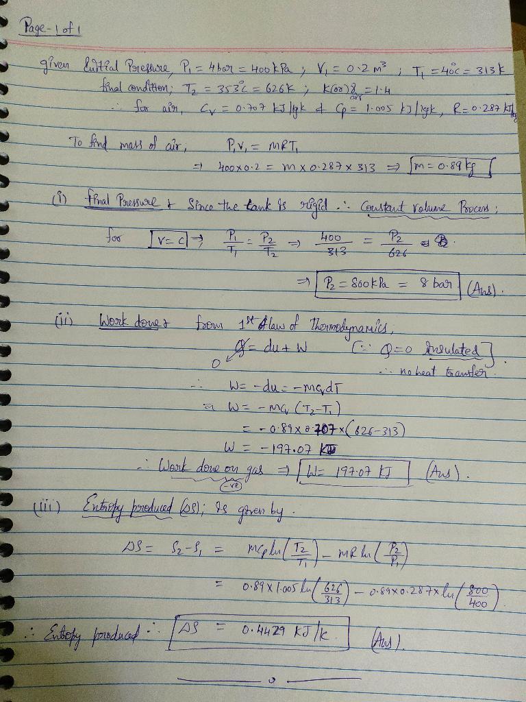 6.27 Air contained in a rigid, insulated tank fitted with a paddle wheel, initially at 4 bar, 40°C and a volume of 0.2 m^3, is s