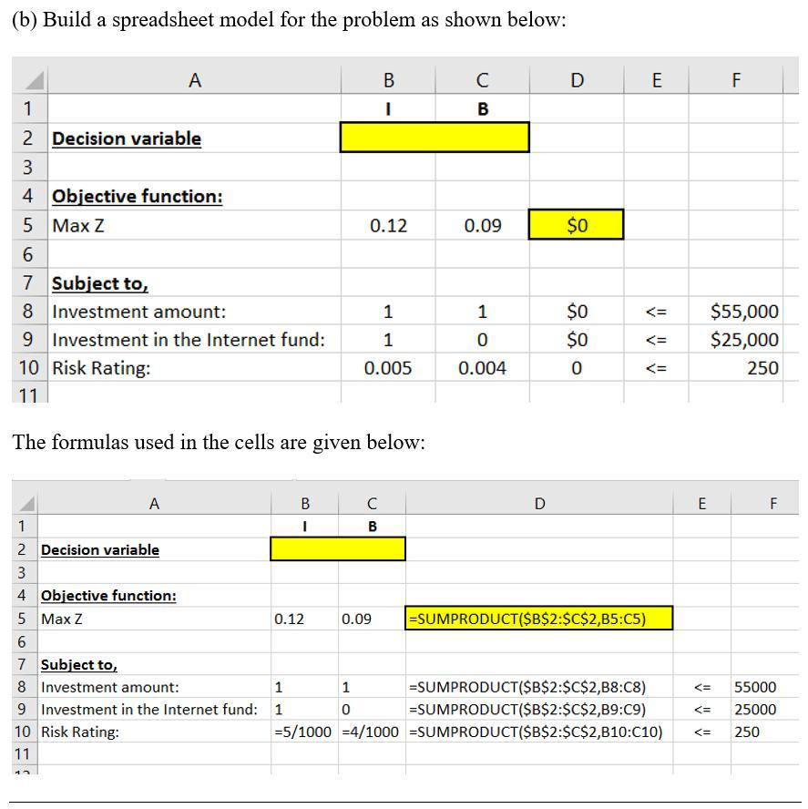(b) Build a spreadsheet model and solve the problem using Solver. What is the recommended investment portfolio for this client? Internet Fund = $ Blue Chip Fund = $ What is the annual return for the portfolio? $