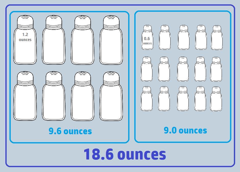 <em>The shakers are filled from a container that has 18.6 ounces of salt.</em>