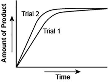 The graph shows the amount of a gaseous product formed over time during two trials of a reaction. A different concentration of a