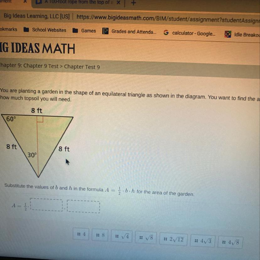 You Are Planting a garden in the shape of an equilateral triangle as shown in the diagram. You want to find the area of the gard