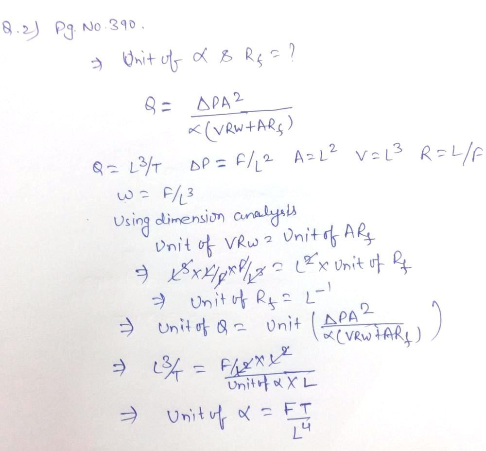 F/L2 the vacuum pressure differential, A ≐ L2 the filter area, α the filtrate "viscosity," V ≐ L3 the filtrate volume, R ≐ L/F the sludge specific resistance, w ≐ F/L3 the weight of dry sludge per unit volume of filtrate, and Rf the specific resistance of the filter medium. What are the dimensions of Rf and and α?