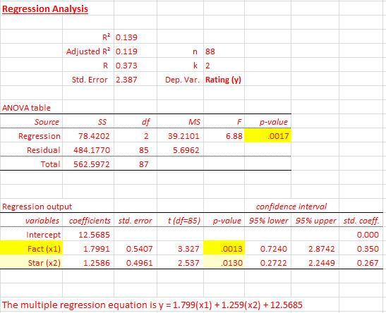 Run a multiple regression where the dependent variable is ratings and the independent variables are star and fact. Use data from