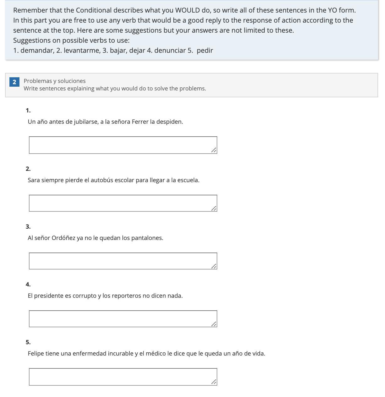 <em>Answer 1: Yo </em><u><em>demandaría</em></u><em> a la empresa para conseguir que me readmitieran. </em>