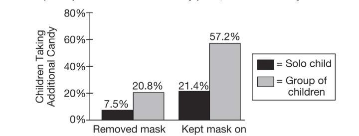 g candy. Some of the children arrived alone, while others arrived in a group. Over the course of the night, the psychologist asked half of the children to remove their masks when they arrived at her door. The remaining half kept their masks on. The psychologist told every child to take only one piece of candy. She then went inside the house, leaving the bowl of candy outside. This gave children the opportunity to take additional candy. The psychologist measured the percentage of children who took additional candy. The psychologist’s hypotheses were that children would take more candy when they were alone and that children would take more candy when they were masked. The results are shown in the graph below; assume all differences are significant.