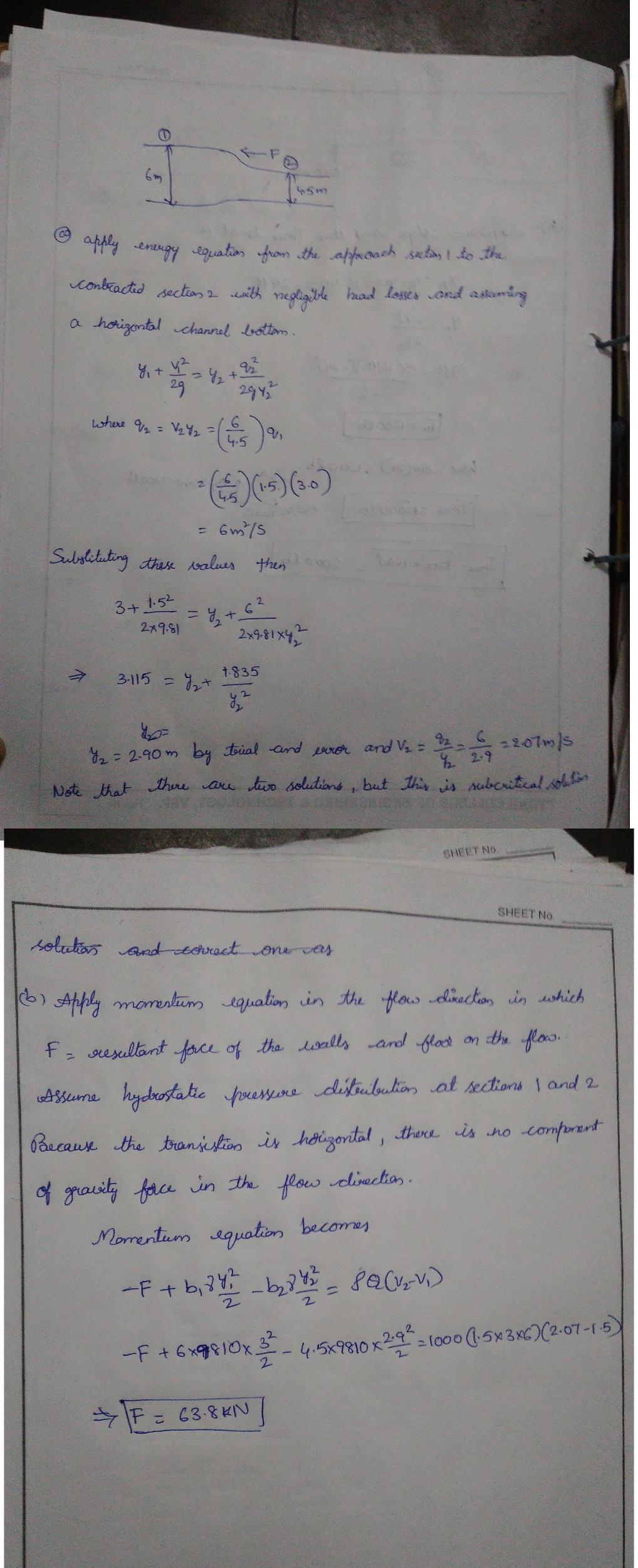 ual contraction to a width of 4.5 m. (a) Calculate the depth and velocity in the contracted section (Hint: y2 is between 2.6~2.9m). (b) Calculate the net fluid force on the walls and floor of the contraction in the flow direction. In each case, identify any assumptions that you made.